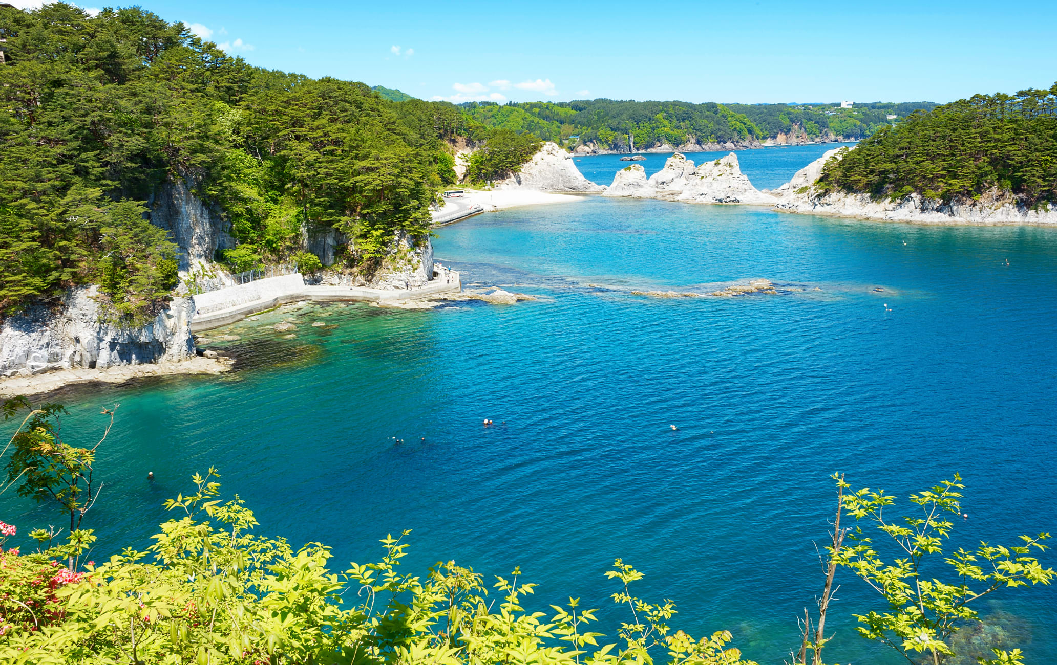이와테여행을 계획 중이라면 바다 또한 빼놓을 수 없습니다. 이와테현 미야코시에 위치한 조도가하마해변은 '일본의 하와이'라 불릴 만큼 맑고 매혹적인 해변 중 하나입니다. 바다색은 그야말로 에메랄드빛이라 사진으로는 담기지 않을 만큼 환상적이죠. 해안선을 따라 펼쳐진 하얀 자갈들과 절벽도 그림같은 풍경을 자아냅니다.