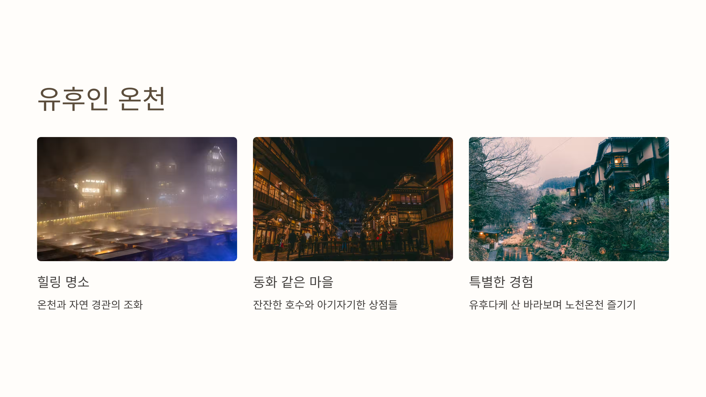 유후인은 온천과 자연 경관이 어우러진 힐링 명소입니다. 잔잔한 호수와 아기자기한 상점들이 어우러져 있어 마치 동화 속 마을 같은 분위기를 느낄 수 있어요. 특히 유후다케 산을 바라보며 즐기는 노천온천은 몸과 마음의 피로를 모두 씻어줄 만큼 특별한 경험을 선사합니다. 🏞️ 이곳에서는 전통 료칸에 머무르며 온천욕과 함께 일본식 정찬을 즐겨보세요!