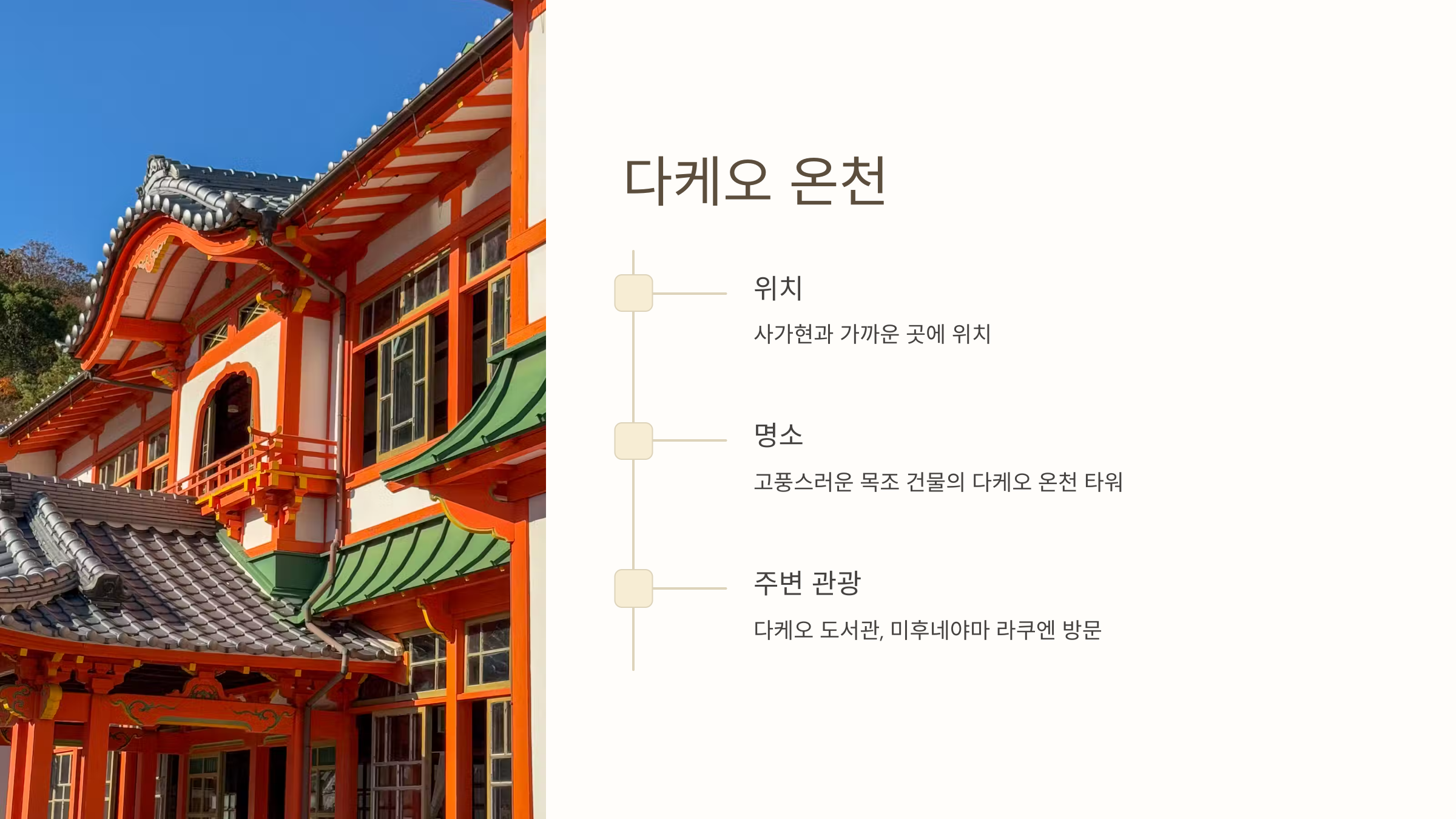 다케오 온천은 사가현과 가까운 곳에 위치해 있으며, 역사적으로도 매우 중요한 온천지입니다. 특히 고풍스러운 목조 건물과 함께 온천을 즐길 수 있는 다케오 온천 타워는 사진 찍기 좋은 명소로도 유명해요. 온천욕 후에는 근처에 위치한 다케오 도서관이나 미후네야마 라쿠엔을 방문해보세요. 아름다운 정원 산책이 힐링의 마무리를 장식해 줄 거예요. 🌸